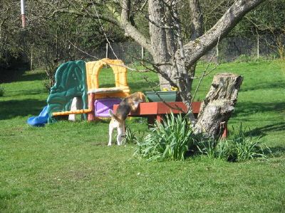 Inca has a nose around the back garden.
